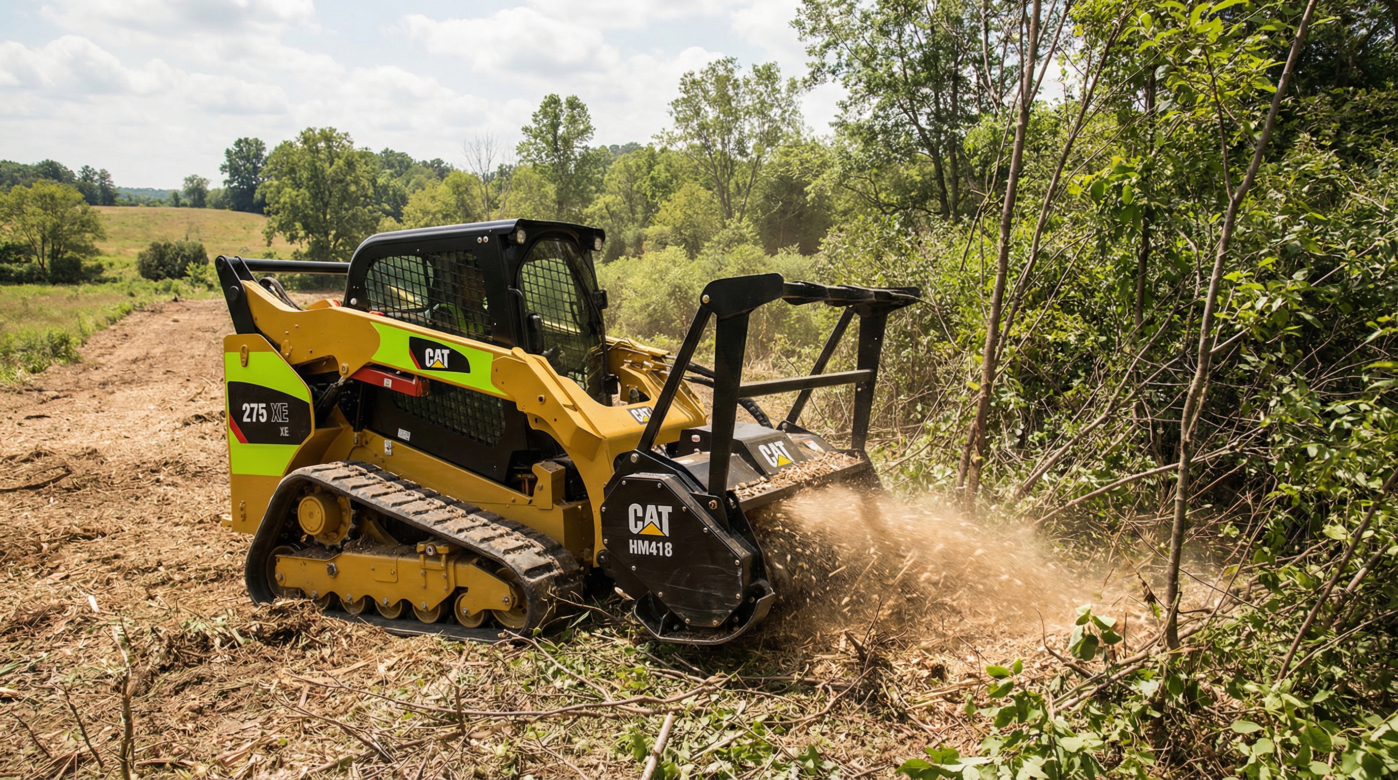 The Cat HM418 mulching head is specifically suited for this work because it processes material in place. Instead of creating burn piles (which are themselves a fire risk), the mulcher grinds brush into a thin layer of fine mulch that decomposes over one to two seasons. That mulch layer retains moisture, making it less flammable than the standing brush it replaced — and far less dangerous than a 6-foot pile of slash waiting to be burned.